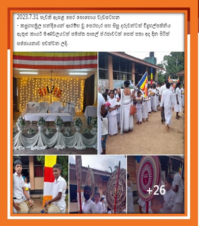 අප පාසලේ නව විදුහල්පතිනියගේ පැමිණීම නිමිතිකොට ගෙන නව විදුහල්පතිනියට හා සිසු දරු දැරියන්ට සෙත් පතා පිරිත් සජ්ජායනාවක් ද පවත්වන ලදි.